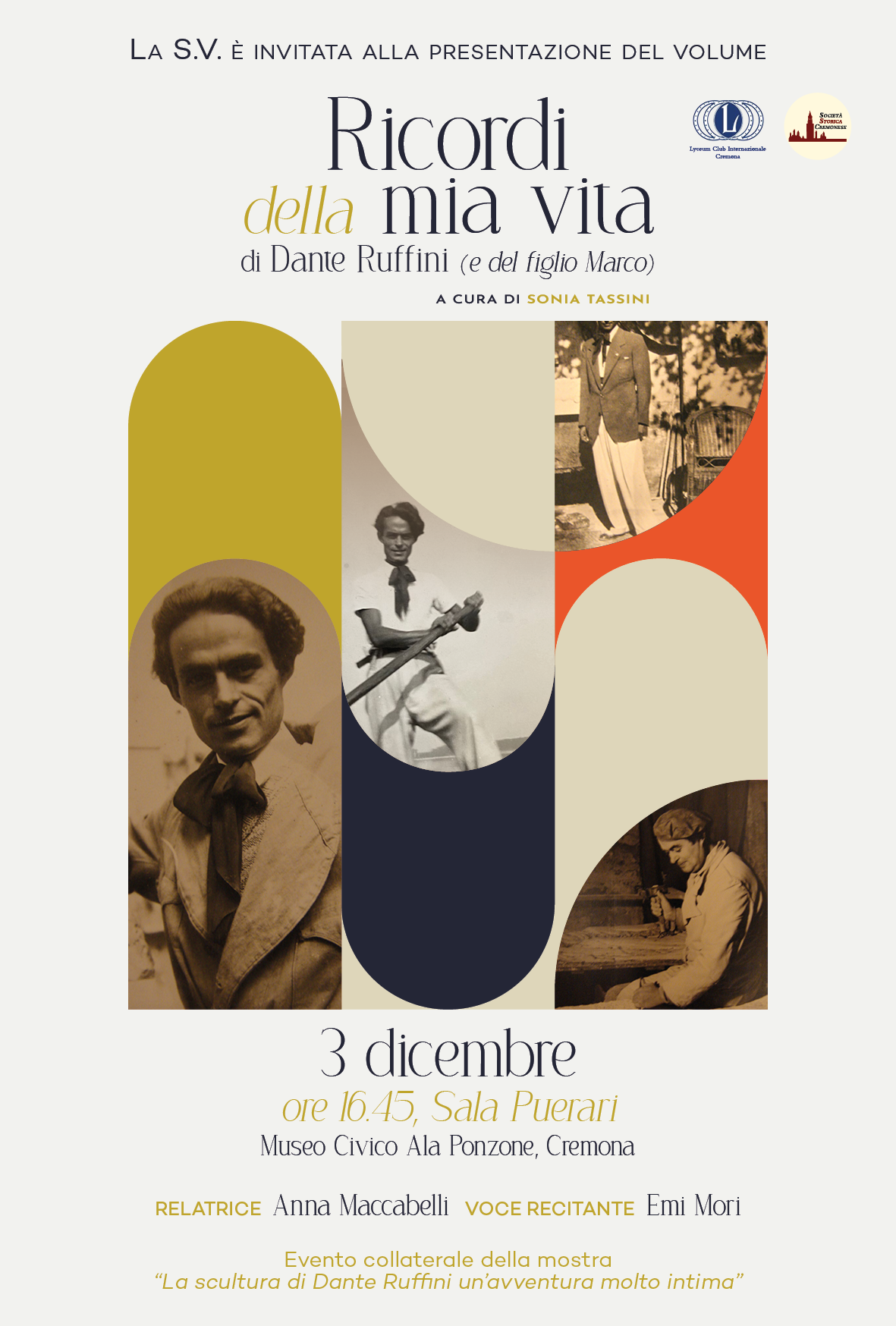 Mercoledì 3 dicembre alle ore 16,45 in Sala Puerari come chiusura delle attività della Società Storica Cremonese per il 2025 sarà presentata la nuova pubblicazione Ricordi della mia vita di Dante Ruffini (e del figlio Marco) curato da Sonia Tassini e patrocinata dalla stessa Società Storica e dal Lyceum Club internazionale Cremona.