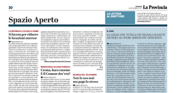 sul numero dello scorso 22 novembre, ho potuto leggere che la morosità causata dal mancato pagamento degli affitti negli alloggi pubblici di proprietà del Comune di Crema ha raggiunto lo straordinario importo di euro 500.000. Ho anche appreso che è intenzione dell’Amministrazione di istituire un’Agenzia per il recupero di tale ingente morosità (c’è almeno da auspicare che questo nuovo organismo non diventi esso stesso una fonte di debito...). Al di là dei risultati che verranno eventualmente conseguiti, mi chiedo, da semplice cittadina, le ragioni per le quali il Comune di Crema abbia trascurato la situazione sino a tal punto, anziché agire tempestivamente per impedire che si determinasse una morosità che, vista l'eccezionalità dell'importo, non sarà, ragionevolmente, più recuperabile. Il deterioramento delle condizioni di solvibilità che soltanto ora viene portato a conoscenza della cittadinanza, non contribuisce a rafforzare un atteggiamento di fiducia nei confronti degli Amministratori del Comune di Crema.