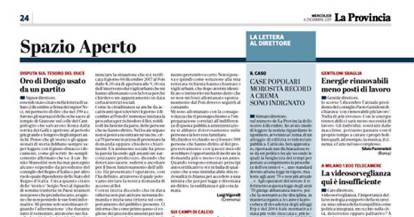 sul numero de La Provincia dello scorso 4 dicembre, ho avuto modo di leggere la notizia riguardante lo sgombero, avvenuto a Crema, di un alloggio di edilizia residenziale pubblica. L’articolo, ben approntato, riporta alcune dichiarazione rese da un politico locale secondo le quali la lunghezza dei tempi per portare a compimento la procedura dell’escomio è «… uno standard dovuto ad una legge in vigore, risalente agli anni ’70 e non più attuale ...».