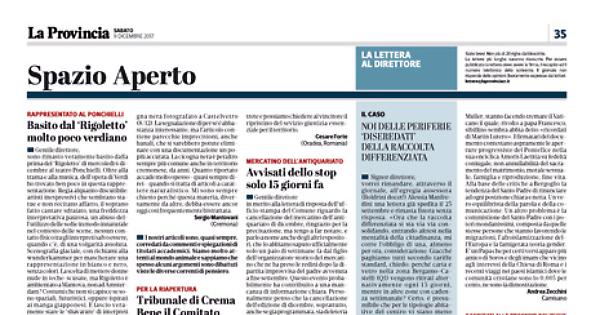 vorrei rimandare, attraverso il giornale, all’egregia assessora (Boldrini docet!) Alessia Manfredini una lettera già spedita il 25 settembre e rimasta finora senza risposta. «Ora che la raccolta differenziata si sta via via consolidando, entrando altresì nella mentalità della cittadinanza, mi corre l’obbligo di una, almeno per ora, considerazione. Giacché paghiamo tutti secondo tariffe standard, chiedo: perché carta e vetro nella zona Bergamo-Castelli (Q1) vengono ritirati alternativamente ogni 15 giorni, mentre in altre zone con cadenza settimanale?