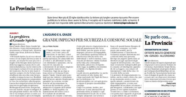 chiedo un piccolo spazio al giornale per ringraziare l’associazione Eridano di Cremona e il presidente Sergio Menta, per aver finanziato un progetto di aiuto per l’orfanatrofio di Mbuji Mayi, in Congo.