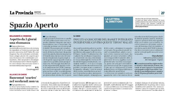voglio portare l’attenzione su quella che dovrebbe essere una cosa stupenda: il Basket Integrato, uno sport meraviglioso, poco conosciuto, che coinvolge persone con diversi gradi di abilità. Possono giocare veramente ma veramente tutti! Io ho avuto modo di farmi affascinare da questo sport due anni fa, durante una partita di beneficenza: me ne sono letteralmente innamorata: la gioia negli occhi di questi ragazzi quando tirano a canestro è la gratificazione per qualsiasi cosa. Ancora oggi, dopo due anni che seguo una delle squadre iscritte al campionato del CSI di Cremona, mi emoziono quando vedo quella gioia nei loro occhi, la soddisfazione di ottenere qualcosa, di gratificarsi per gli sforzi fatti, di vincere. In questi due anni ho assistito a diverse partite anche di altre squadre, in particolare mi riferisco alla squadra di Soresina, il Magico Basket: l’entusiasmo e la voglia di vincere di questi ragazzi sono veramente una cosa emozionante. Tralasciando quello che si potrebbe dire dei ragazzi normodotati, i cosiddetti numeri 5, e di chi si occupa dell’allenamento, mi soffermerei sul pubblico, sempre pronto a sostenere la squadra: durante i quattro tempi della partita, non si limitano ad incitare la propria squadra, anzi questo non lo fanno proprio; si impegnano, d’altro canto, a denigrare la squadra avversaria. Fin quanto si tratta di ‘insulti’ ai normodotati, adulti e vaccinati, credo si possa sorvolare, ma quando ad essere scherniti e offesi sono i ragazzi diversamente abili, la questione diventa agghiacciante: gente che urla ‘cicciona’ a una ragazza, gente che urla per confondere i giocatori avversari che si apprestano al tiro; qui si è oltrepassato il limite della decenza: mi dispiace dirlo ma si tratta di bestie, non di tifosi.