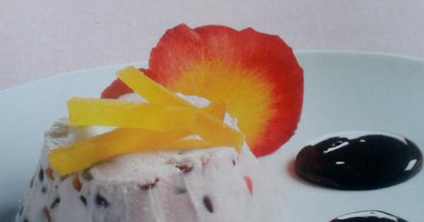 Ingredienti (per 6 persone). 500 gr di ricotta di pecora, 250 gr di zucchero, 250 ml di panna fresca, 8 gr di gelatina in fogli, 50 gr di frutta candita a dadini, 50 gr di cioccolato fondente a scaglie, 50 gr di granella di nocciole tostate, 1 cucchiaio di essenza di rosa. Per la salsa al cioccolato: 100 gr di cioccolato fondente, 200 gr di panna fresca.