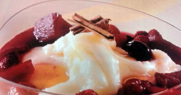 Ingredienti (per 4 persone): 250 gr di frutti di bosco misti (lamponi, more, mirtilli, fragoline), mezza pera, una grossa prugna, 250 gr di gelto alla crema, 2,5 dl di vino rosso, 180 gr di zucchero di canna, 1 stecca di cannella, 1 chiodo di garofano, 4 cucchiai di miele d'acacia.