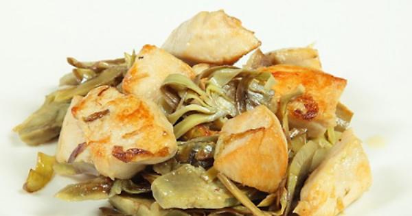 Pulire il petto di pollo togliendo le ossa ed i filamenti e ridurlo a pezzetti di un centimetro circa. Trascorso il tempo di cottura dei carciofi alzare la fiamma ed unire il pollo. Farlo rosolare quindi abbassare la fiamma e far cuocere per una decina di minuti, girando di tanto in tanto. Il tempo di cottura esatto dipende dalla grandezza dei pezzetti di pollo e dalla tenerezza della carne. Se il fondo di cottura dovesse asciugarsi troppo, aggiungere del brodo.