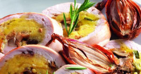 Legare l’arrosto con lo spago da cucina, in modo che il ripieno non fuoriesca, appoggiarlo su una teglia coperta con carta da forno, ungere bene di olio e salare. Tagliare a metà 5-6 scalogni, senza sbucciarli e contornare con essi l’arrosto, aggiungere qualche rametto di santoreggia e infornare a 190 °C per 40′ circa.