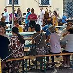Invece la pioggia, a sprazzi, ha bagnato la festa. I commensali che si erano prenotati per tempo si sono in gran parte presentati e hanno potuto prendere posto sotto una tettoia o sotto qualche albero, nella sala di accoglienza o nell’androne d’ingresso. Non pochi gruppi si sono mostrati più coraggiosi e ottimisti occupando tavoli e sedie al centro del cortile. Se proprio fosse stato necessario, c’erano gli ombrelli a disposizione per coprire oltre agli ospiti, anche tortelli, foiolo, salamelle e patatine fritte. «Sono veramente coraggiosi i nostri sostenitori», hanno commentato con compiacimento i dirigenti della scuola materna impegnati nel servire i commensali ai tavoli, dal presidente Massimo Rognoni al vice Attilio Maccoppi e a tutti gli altri.