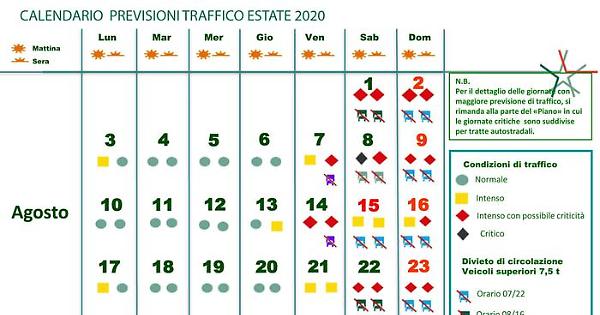ROMA (24 luglio 2020) - Giornata da bollino nero sulle autostrade italiane il prossimo otto agosto. E' quanto prevdde il Piano dei servizi per lïesodo estivo 2020 di Viabilità Italia. I dati di traffico riferiti a questi ultimi due mesi hanno suggerito di contrassegnare con il "bollino rosso" i fine settimana del 24 - 26 luglio e del 31 luglio - 2 agosto prossimi. Il fine settimana del 7 - 9 agosto è quello in cui si prevedono i maggiori volumi di traffico, con una previsione di criticità da bollino nero per la mattina di sabato 8 agosto.
