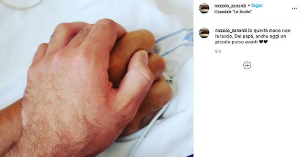 Intanto il figlio del campione, Niccolò, ha postato sui suoi profili social una foto nella quale tiene la mano del papà con il testo: "Io questa mano non la lascio. Dai papà, anche oggi un piccolo passo avanti". (ANSA)