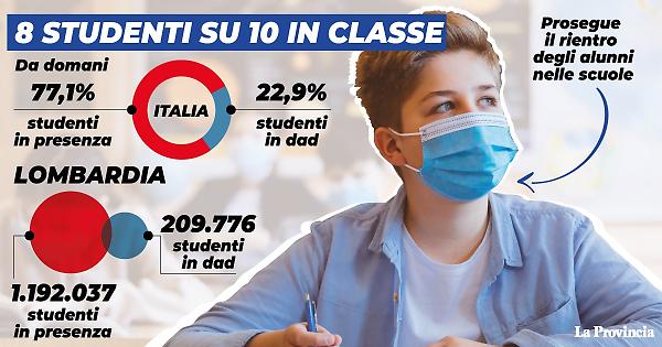 ROMA (11 aprile 2021) - Prosegue il rientro degli studenti nelle loro classi. Da domani saranno quasi 6,6 milioni gli alunni presenti a scuola sugli 8,5 milioni delle scuole statali e paritarie, 8 su 10. Quasi un milione in più della settimana scorsa, di cui ben 400 mila in Lombardia. L’unica regione in controtendenza la Sardegna, dove 63 mila alunni di seconda e terza media e delle superiori lasceranno le aule e si collegheranno da casa. In tutto saranno quasi 2 milioni quelli ancora a casa in Dad. Saranno tutti a scuola i bambini della scuola dell’infanzia e primaria, saranno l’87% in classe gli alunni della scuola media, mentre solo il 38% dei ragazzi delle superiori potrà frequentare, con la consueta alternanza del 50% e fino al 75% nelle regioni in cui è consentito.