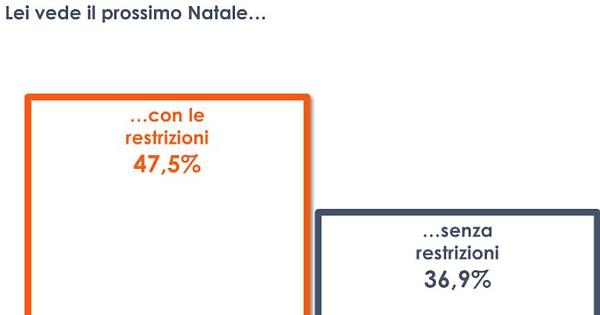 ROMA - Manca un mese al Natale e, anche quest'anno, ci troviamo ad affrontare un aumento dei casi positivi al Covid19 e una nuova ondata di contagi. Con queste premesse, quasi la metà degli italiani (il 47,5%) teme un nuovo Natale con restrizioni, così come successo per quello del 2020. Tra i più convinti dell'arrivo di nuove limitazioni c'è la parte di popolazione non vaccinata, ritenuta, in molti casi, la fonte principale della diffusione dei contagi. Incertezze che si riflettono anche sulle spesa delle famiglie...Il campione, infatti, si divide tra chi crede ci sarà un aumento dei consumi per il periodo natalizio e chi, invece, prevede una diminuzione o, al limite, un livello invariato rispetto allo scorso anno. Quello che invece appare certo per 3 italiani su 4 è che i prezzi di beni e servizi in vista del Natale stanno subendo un notevole aumento, in corso già da qualche settimana. Dati Euromedia Research - Realizzato il 17/11/2021 con metodologia mista CATI/CAWI su un campione di 800 casi rappresentativi della popolazione italiana maggiorenne . fsc/com 24-Nov-21 12:14