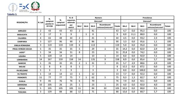 ROMA - In Italia il 10 gennaio scorso la variante Omicron aveva una prevalenza stimata al 100%, con la sottovariante BA.5 largamente predominante e una quota di ricombinanti omicron/omicron pari al 3,6%. Sono questi i risultati dell'indagine rapida condotta dall'Iss e dal Ministero della Salute insieme ai laboratori regionali e alla Fondazione Bruno Kessler. Per l'indagine è stato chiesto ai laboratori delle Regioni e Province Autonome di selezionare dei sottocampioni di casi positivi e di sequenziare il genoma del virus. Il campione richiesto è stato scelto dalle Regioni/PPAA in maniera casuale fra i campioni positivi garantendo una certa rappresentatività geografica e, se possibile, per fasce di età diverse. In totale, hanno partecipato all'indagine tutte le Regioni/PPAA, e complessivamente 98 laboratori regionali e il Laboratorio di Sanità Militare, per un totale di 1191 campioni. Queste le prevalenze stimate 100% variante omicron BA.2 9,8% (range: 0% -25,8%) BA 4 0,3% (range: 0% -11,1%) BA 5 86,3% (range: 74,2% - 100,0%) Omicron/omicron 3,6% (range 0%-9,5%). - foto ufficio stampa Istituto superiore di sanità - . fsc/com 20-Gen-23 14:40