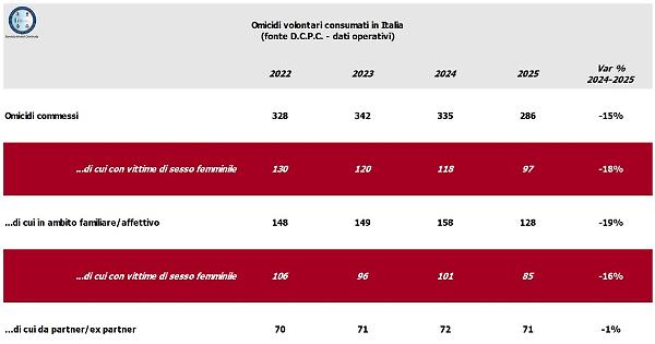ROMA - In base ai dati del Ministero dell'Interno emerge che nel corso del 2025 gli omicidi (tutti i casi di assassinio volontario indipendentemente dal genere della vittima) sono calati complessivamente del 15%, passando dai 335 del 2024 ai 286 dell'anno appena concluso, il numero più basso dell'ultimo decennio. I dati del Viminale indicano che la flessione riguarda in particolare la fattispecie specifica dei femminicidi, diminuiti del 18% nel 2025 rispetto al 2024. Sono state infatti 97 le donne assassinate lo scorso anno rispetto alle 118 del 2024, alle 120 nel 2023 e alle 130 del 2022. Tra le 97 vittime del 2025 si segnala che 85 sono state uccise per mano di un soggetto riconducibile all'ambito familiare-affettivo, una casistica che segna un -16% rispetto al 2024. - Foto ufficio stampa Ministero dell'Interno - . sat/com 19-Gen-26 16:04