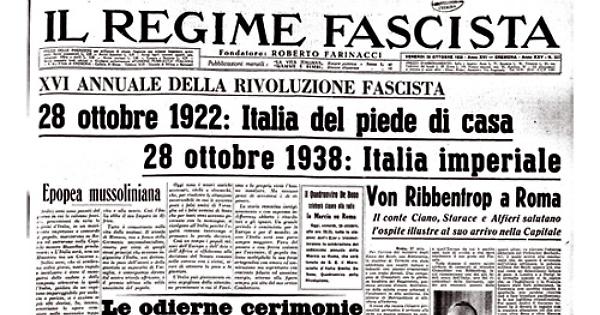Sedici anni sono passati dal giorno in cui le colonne fasciste provenienti da tutte le regioni d'Italia, in un movivento impetuoso e concorde di popolo, marciarono su Roma ed entrarono nella Capitale mentre Mussolini proclamava: « L'Italia avrà, non un Ministero ma un Governo »