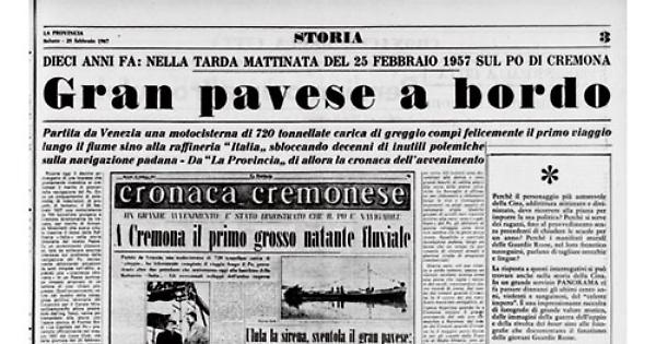 Una Impresa che giustamente rivendica ai cremonesi il merito di pionieri i della navigazione del Po. Dopo un cinquantennio di polemiche, di indecisioni, di progetti, di tentativi, Il 25 febbraio 1957 una motocisterna da 720 tonnellate giungeva a Cremona direttamente da Venezia, per merito di Armando Moschetti che aveva voluto Inserire il nome della Raffineria " Italia " nella storia idroviaria del nostro Paese Fu un avvenimento clamoroso, tale da sollevare enorme interesse sul problema della navigazione del Po, decisamente sbloccando situazioni da anni rimaste nell'oblio, aprendo una « coscienza idroviaria » In un Paese purtroppo rimasto arretrato in un settore di così chiaro progresso.