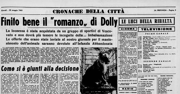 Si è positivamente risolta la vicenda della leonessa Dolly, lo splendido animale sul cui capo pendeva fino all'altro giorno la minaccia di morte: il proprietario signor Cornetti ha ceduto il felino alla società sportiva di Vescovato, che già della leonessa aveva fatto la sua mascotte; così ora Dolly è sistemata: ha un tetto e ha di che mettere sotto i denti.