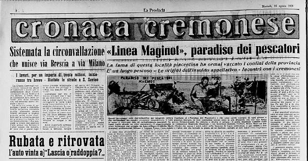 Perchè questo punto della sponda piacentina, divenuto tanto caro ai cremonesi, ma non solo ad essi ma a migliaia di pescatori dilettanti, viene chiamato « linea Maginot »? Come il famoso sistema difensivo francese? Bisogna rifarsi a 16, 17 anni fa, al periodo bellico. Allora non c'era il pennello ed il nostro fiume scorreva ove attualmente c'è la lanca adibita ora a riserva di pesca e che si è formata appunto dopo la costruzione della « difesa » per incanalare verso la sponda cremonese il corso dell'acqua. Il Comando tedesco trovò che la zona sì prestava ottimamente alla creazione di depositi di carburante e di armi. In poco tempo furono scavate buche e furono immessi vasti recipienti per creare il grande deposito. Un gruppo di militari tedeschi fu distaccato a guardia della zona ed a capo di questo drappello fu posto un sergente. Fu allora che qualcuno,-memore che la « lìnea Maginot » era stata ideata da un sergente di cui appunto prese il nome, prese a chiamare quel punto della sponda piacentina «linea Maginot». L'appellativo ebbe fortuna e rimase.