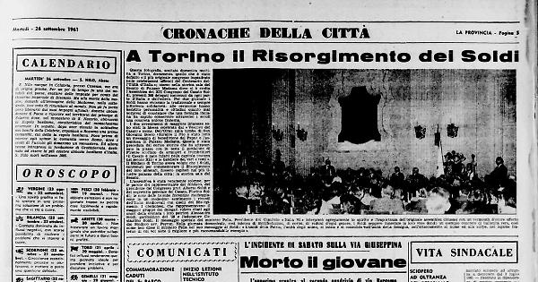 Questa fotografia, scattata domenica mattina a Torino, documenta quello che è stato definito « il più originale congresso inquadrato nelle celebrazioni ufficiali del Centenario dell'Unità d'Italia»; siamo nella storica sala del Senato di Palazzo Madama dove si è svolta l'Assemblea del XII Congresso del Casato Soldi, presenti 300 delegati convenuti da ogni parte d'Italia e dall'estero. Per due giornate i Soldi hanno rivissuto la tradizionale e sempre pittoresca solidarietà: alle cerimonie hanno assistito personalità e cittadini quanto mai sorpresi di constatare che una famiglia italiana ha saputo conservare attraverso i secoli una concreta unione fraterna.