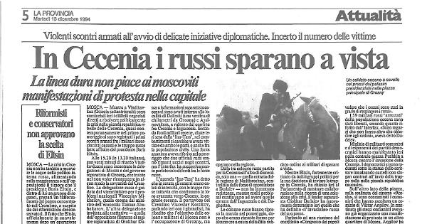 Mentre Eltsin, fortemente criticato da tutti i gruppi politici per la sua decisione di inviare le truppe in Cecenia, ha chiesto ieri al Parlamento di mostrare collaborazione nella ricerca di una soluzione alla crisi, il leader separatiste Giokhar Dudaiev ha nuovamente denunciato ieri quella che ha definito «l'invasione» russa del suo paese, dicendo, fra l'altro, che «il mondo intero ha potuto vedere che i ceceni sono stati in grado di respingere i russi».