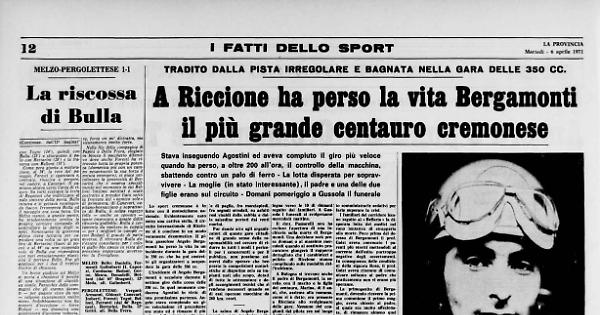 Il pilota gussolese Angelo Bergamonti ha perso la vita in un incidente durante la gara delle 350 cc. che ha poi costretto gli organizzatori a sospendere la gara delle 500 cc.