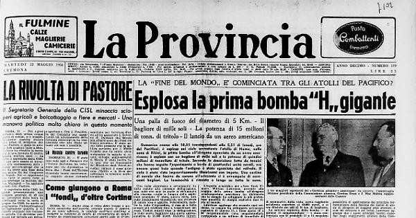Domenica scorsa alle 18,51 (corrispondenti olle 5,51 di lunedì, ora del Pacifico), è esplosa nel cielo sovrastante l'atollo di Namu, nella zona di Bikini, la prima bomba all'idrogeno sganciata da un aereo americano; è esplosa con un bagliore di mille soli e la potenza di quindici milioni di tonnellate di tritolo. Secondo la descrizione fatta da tecnici che hanno seguito l'esperimento a bordo di quattordici unità navali, era ancora quasi buio quando l'ordigno è stato sganciato dal velivolo. Il cielo è stato visto improvvisamente illuminarsi con impeto. Una cortina di nuvole che faceva da corona all'orizzonte si è avvampata di accecanti bagliori. La luminosità è rimasta a lungo su tutta la zona.