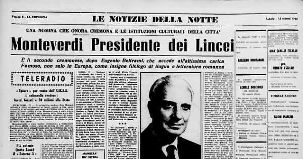 Il prof. Monteverdi, che succede nell'alta carica accademica al prof. Cassinis, deceduto mesi or sono, è nato a Cremona nel 1887. Laureatosi giovanissimo a Milano ha compiuto studi e ricerche presso le università ed i centri culturali di Firenze, Berlino e Parigi. Ha insegnato tra l'altro all'Università svizzera di Friburgo e da vari anni fa parte del corpo accademico dell'Università di Roma. Autore di centinaia di studi e di opere di grande importanza internazionale, il prof. Monteverdi gode larga fama non solo in Italia ma anche all'estero, quale successore del prof. Arancio Ruiz, pure recentemente scomparso.