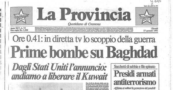 Ore 0.41: in diretta dalla rete televisiva 'Cnn' la prima drammatica testimonianza dello scoppio della guerra: con la voce del corrispondente della rete televisiva americana John Holliman si sentivano gli scoppi delle bombe.