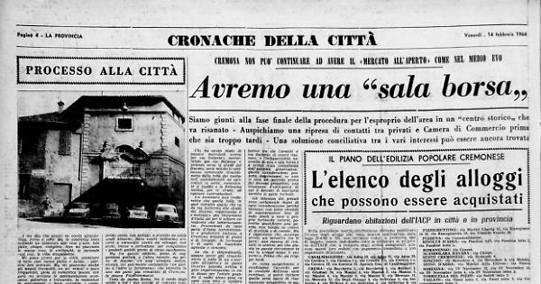 Se come auspichiamo e confidiamo, l'accordo per la cessione dell'area sarà concluso, si potrà iniziare quella seria opera di risanamento urbanistico in pieno centro che è reclamata dall'igiene e dalla civiltà. E la «piazza mercantilistica» di Cremona, sempre nota e frequentata in ogni secolo, avrà finalmente la sua degna sala di contrattazioni, con evidenti vantaggi per tutta l'economia cremonese.