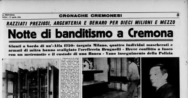 Cremona terra di conquista per i malviventi? Parrebbe, a giudicare dall'operazione banditesca effettuata la notte scorsa da quattro individui mascherati che hanno svaligiato la gioielleria Brugnelli di via Verdi, riuscendo ad arraffare argenteria (appena arrivata da Londra) ed una manciata di orologi per un valore che si aggira sui dieci milioni di lire.