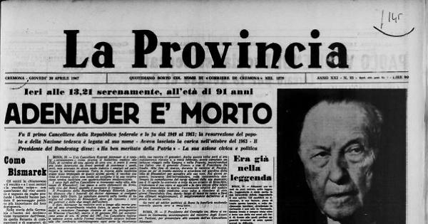 Fu il primo Cancelliere della Repubblica federale e lo fu dal 1949 al 1963; la resurrezione del popolo e della Nazione tedesca è legata al suo nome - Aveva lasciato la carica nell'ottobre del 1963 – Il Presidente del Bundestag disse:«Ha ben meritato della Patria»
