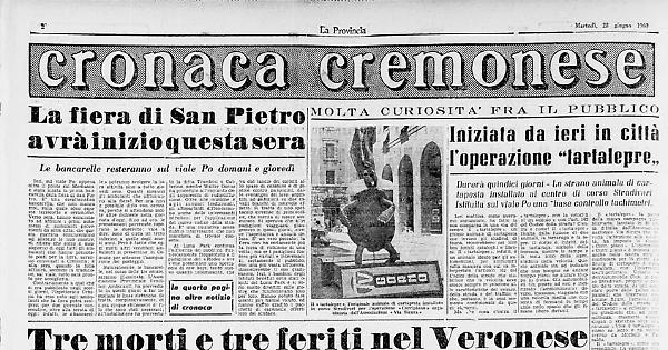 Ha fatto la sua comparsa in una via del centro il «tartalepre», un grosso animale di cartapesta che invano gli studiosi di fauna, troverebbero nei loro ben forniti cataloghi e libroni. Il «tartalepre», infatti, è un animale ideato per gli automobilisti, per ammonirli sulla maniera con cui va interpretato l'articolo 102 del Codice della strada che stabilisce che la velocità deve essere sempre in relazione alle caratteristiche del veicolo, della strada e del traffico e che, pertanto, è in ogni momento condizionata da questi elementi.