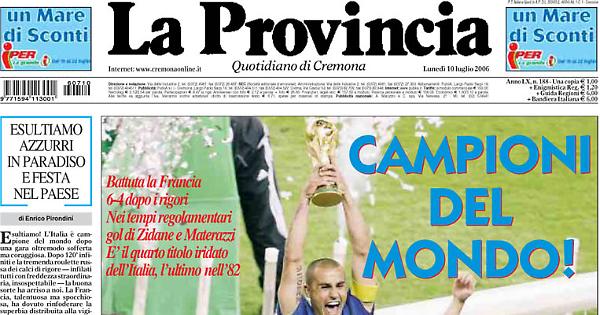 Dal dischetto gli azzurri hanno segnato tutti (Pirlo, Materazzi, De Rossi, Del Piero e Grosso), i francesi hanno sbagliato solo con lo juventino Trezeguet. Nel secondo tempo supplementare francesi in dieci per l’espulsione di Zidane, colto in una testata a Materazzi. Subito dopo il fischio finale è scoppiata l’esultanza in tutta la provincia.