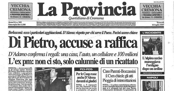 Che viene a galla per un telefonino che, in un dossier di Craxi ripreso dai giornali, viene definito uno dei regali fatti dal costruttore al magistrato. Sembrerebbe solo una palata di fango. Poi D'Adamo finisce due giorni in galera per una mazzetta alla giunta di Segrate, quasi a confermare che intoccabile non è. Ma è l'inizio della fine. I suoi guai si moltiplicano. A questo punto, il 3 settembre del'95, i magistrati di Brescia intercettano una telefonata: Berlusconi gli chiede aiuto per tenere Di Pietro lontano dalla politica.
