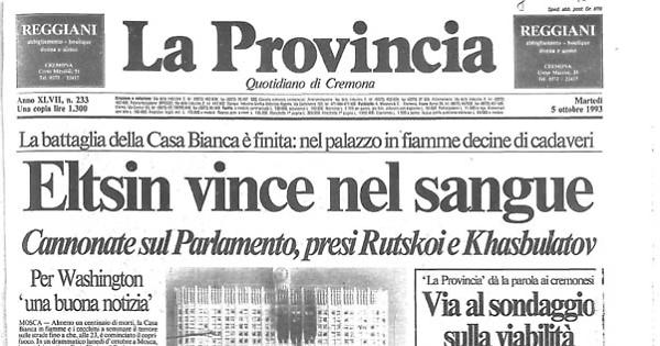 A mezzogiorno il Parlamento — colpito pesantemente e ripetutamente dai proiettili sparati dai carri armati appostati sul ponte sulla Moscova — era ormai in fiamme, mentre alla stessa ora la televisione riprendeva a trasmettere su tutti i quattro canali. Il primo canale — dopo la riconquista degli studi di Ostankino da parte delle forze governative — era stato ripristinato alle 9 con un intervento del presidente Eltsin, che aveva nuovamente addossato su Rutskoi e Khasbulatov la responsabilità del sangue versato in questi giorni a Mosca.