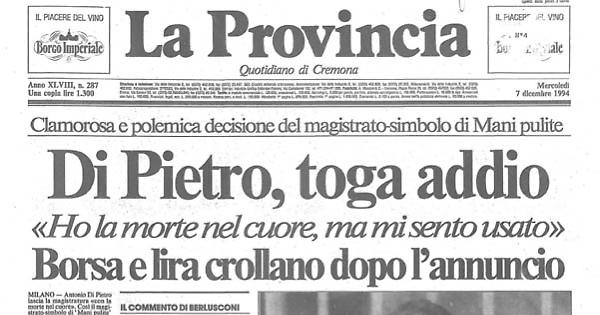 Con il suo gesto Di Pietro si propone di riportare «serenità e fiducia nelle istituzioni» e immagina di «spersonalizzare» l'inchiesta 'Mani pulite'. Ieri la notizia delle dimissioni di Di Pietro ha cambiato la giornata politica. Numerose le prese di posizione. Terremoto anche a Piazza Affari con lira e Borsa in forte calo.