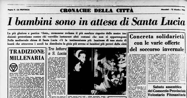 Vorremmo veramente che per tutti i bambini indistintamente fosse una S. Lucia come essi desiderano. Vorremmo utopisticamente che S. Lucia riuscisse, con l'aiuto di chi potrebbe, ad essere uguale per tutti. Purtroppo invece su molti comodini quando il bimbo si sveglierà non troverà ciò che aveva tanto sognato. La sua mamma, il suo babbo forse racconteranno che «S. Lucia non aveva più doni», forse in un attimo di scoramento e trattenendo le lacrime gli diranno che è stato cattivo. Piccole bugie per nascondere la realtà dei fatti: l'impossibilità del bilancio familiare di spendere.