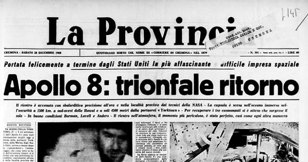 Frank Borman, James Lovell e William Anders, con la loro capsula sono scesi nelle acque dell'Oceano Pacifico, millecinquecento chilometri circa a sud-ovest delle isole Hawaii, quando ancora sull'oceano non era sorto il sole: ma i marinai della Yorktown hanno potuto scorgere ad occhio nudo il vascello spaziale, di ritorno dopo il viaggio di sei giorni che lo ha portato a girare intorno alla Luna. Esso è infatti ammarato esattamente a 4500 metri dalla nave, ma, come del resto era già stato deciso, il comandante ha atteso la luce del giorno per provvedere alle operazioni di recupero. Un elicottero ha trasportato i tre uomini sul ponte della portaerei, dove l'equipaggio ha tributato loro i primi onori del trionfo. Un tappeto rosso è stato srotolato davanti al portello dell'elicottero, mentre una guardia d'onore ha preso posizione da entrambi i lati e i marinai applaudivano e sventolavano bandiere degli Stati Uniti.