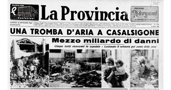 Una tromba d'aria di inaudita violenza si è abbattuta ieri pomeriggio verso le 14 su Casalsigone. una frazione di Pozzaglio con 600 abitanti, dopo avere sfiorato la periferia di Oimeneta. Mentre per Olmeneta i danni sono insignificanti, per Casalsigone il « tornado » ha lesionato il settanta per cento delle abitazioni provocando cinque feriti. I danni assommano a circa mezzo miliardo...... Carri agricoli e trattori posti nell'aia sono stati sollevati come fuscelli, i muri delleabitazioni ma soprattutto quelli che costeggiano le aie delle cascine vennero distesi come birilli. Gli abitanti sbigeititi come