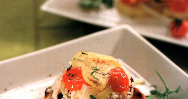 di aglio, cipolle, sedano, prezzemolo, pomodorini e basilico. Copriamo con uno strato di patate, saliamo leggermente e spolverizziamo con del formaggio pecorino.