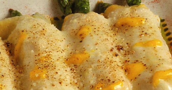 Procedimento: Cuocete a vapore gli asparagi per 8-10 minuti in modo che rimangano al dente. In una padella con una noce di burro fate dorare lo speck. Unite ai formaggi metà della besciamella, lo speck, lo zafferano, sale e pepe. Rosolate con circa metà del burro rimasto le punte di asparagi per pochi minuti. Distribuite su ogni crèpes una parte della besciamella ai formaggi, adagiatevi le punte di asparagi in modo che i germogli fuoriescano dalle estremità e richiudeteli come dei cannelloni. Allineateli man mano in una pirofila imburrata, cospargete con la restante besciamella, il grana e fate gratinare in forno per 15-20 minuti. Servite le crèpes ben calde.