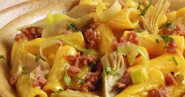 320 gr di tortiglioni, 4 carciofi, 2 porri, 200 gr di salsiccia, 1/2 bicchiere di vino bianco secco, 150 gr di provolone dolce, 1 limone, qualche cucchiaio di besciamella, prezzemolo tritato, 1 bustina di zafferano, 20 gr di burro, 4 cucchiai di olio extravergine di oliva, sale e pepe q.b.