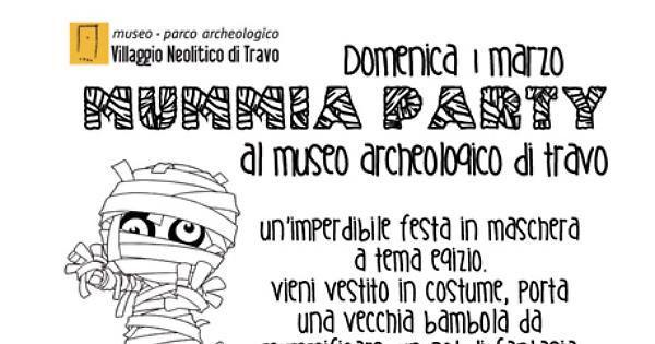 Il MUMMIA PARTY e' una festa in costume. Si può andare vestiti come si vuole, unica clausola il tema egizio. Il Museo di Travo per l'occasione si trasformerà in un laboratorio per la mummificazione: si può portare una vecchia bambola o un vecchio giocattolo, insieme gli daremo una nuova vita!