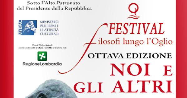 L’ottava edizione della manifestazione culturale itinerante ‘Festival filosofi lungo l’Oglio’ si svolgerà dal 6 giugno al 25 luglio 2013. La kermesse, fedele al suo spirito itinerante, coinvolge sedici Comuni tra le province di Brescia e Cremona, tra castelli, chiese, piazze, borghi, cascine si alterneranno pensatori di caratura internazionale per declinare la parola chiave prescelta: ‘Noi e gli altri’. Uno straordinario momento culturale, voluto ed organizzato dal direttore scientifico dell’associazione Filosofi lungo l’Oglio Francesca Nodari, che sposa la causa del territorio, consentendo di conoscere anche le bellezze artistiche meno conosciute della Valle dell’Oglio.