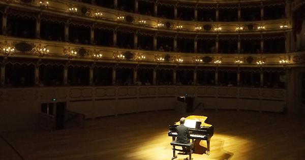 Che l’occasione sia di quelle che poche volte capitano, lo suggerisce anche il particolare e temporaneo assetto della sala. Il pianoforte è posizionato al centro della platea, spoglia di poltrone a causa dei lavori di rinnovamento.