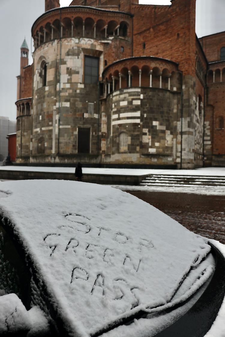 CREMONA - Ampiamente annunciata nei giorni scorsi, le neve è caduta in provincia di Cremona già in mattinata. Tra magia incantata e qualche inevitabile disagio, compresa la sospensione dei match dei campionati di calcio dilettantistici: a Pandino si è provato a stendere in rosso le righe del campo, ma la sfida fra Luisiana e Albinogandino è stata comunque rinviata. C'è anche chi, in pieno centro storico a Cremona, ha sfruttato la superficie innevata di un parabrezza per tracciare un messaggio polemico: "Stop Green Pass".