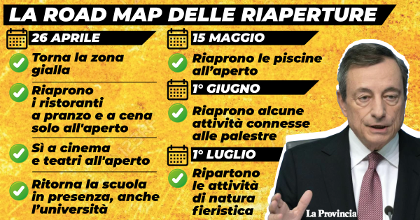 A GIUGNO RIPARTE LO SPORT, A LUGLIO LE FIERE. «Il 26 aprile è la data chiave in cui ripristiniamo le zone gialle, investendo sugli spazi aperti. Poi una road map accompagnerà le riaperture: il primo giugno alcune attività sportive, il primo luglio le attività fieristiche», ha detto il ministro della Salute Speranza.