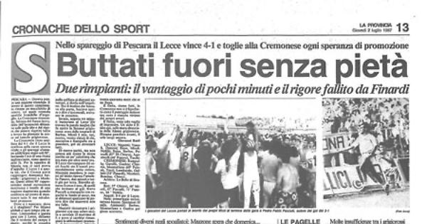 Nello spareggio di Pescara il Lecce vince 4-1 e toglie alla Cremonese ogni speranza di promozione. Buttati fuori senza pietà. Due rimpianti: il vantaggio di pochi minuti e il rigore fallito da Finardi.