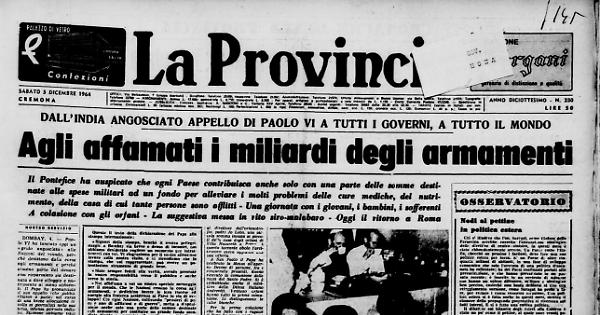 BOMBAY. 4. Paolo VI ha lanciato oggi un «grido angosciato» alle Nazioni del Mondo, perchè desistano dalla corsa agli armamenti e perchè almeno parte del denaro così risparmiato sia destinata a dare alloggio e nutrimento ai meno abbienti. Il Papa ha pronuncialo il suo appello nel corso di una breve allocuzione rivolta ai giornalisti nella sua terza, intensa giornata indiana. Stamane abbiamo visto Paolo VI in visita all’ospedale generale, dove i suoi occhi si sono velati di commozione alla vista dei piccoli ammalati immagini di una antica miseria, e «Ospedale della miseria» viene infatti chiamato il grigio edificio che sorge nel cuore del popoloso quartiere di Byculla. E l'istituto più importante dell'India, ha centinaia di medici, settecento infermieri, e vi hanno ricovero diecimila pazienti.