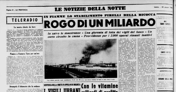 Un colossale incendio, nel quale non si lamentano per fortuna perdite umane, è divampato questa mattina alle 3 in uno dei reparti per il trattamento tessuti per pneumatici presso gli stabilimenti di Milano-Bicocca della Pirelli.