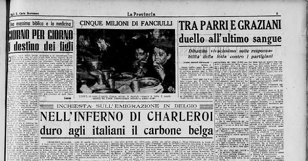 Girano a frotte, gli italiani, per la vasta e disseminata Charleroi, la città dei novantasette pozzi minerari, la città edificata sul carbone. I pozzi sono un po' dappertutto. Si distinguono appena dalle officine. L'accesso alla miniera non avviene, come il profano si immagina, attraverso una galleria o un buco nella terra, ma attraverso un portone, delle scale e dei corridoi. Sembra di entrare in un ministero, anziché in un pozzo di carbone.